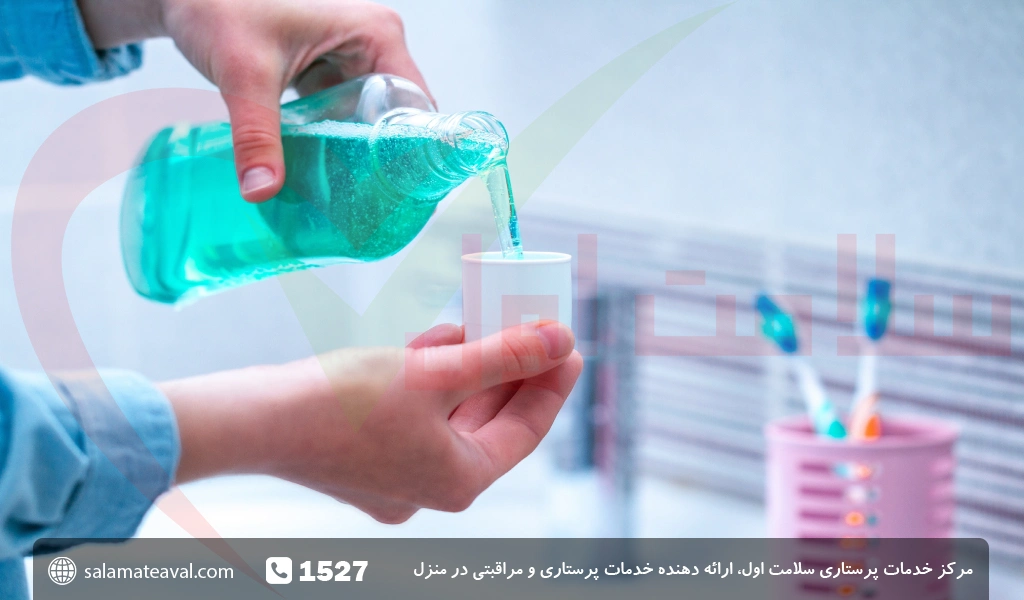• دهانشویه را در دهان بچرخانید و غرغره کنید. از قورت دادن دهانشویه خودداری کنید.